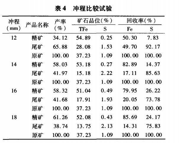 從表4可以看出,沖程在14mm指標(biāo)較好。說明沖程在14mm的時候,各產(chǎn)品得到了較好的松散,在這種磁場作用下,精礦的產(chǎn)率達(dá)到58.03%,回收率達(dá)到了82.89%,*終硫在精礦里面的品位只有0.1%左右,達(dá)到了國標(biāo)要求。